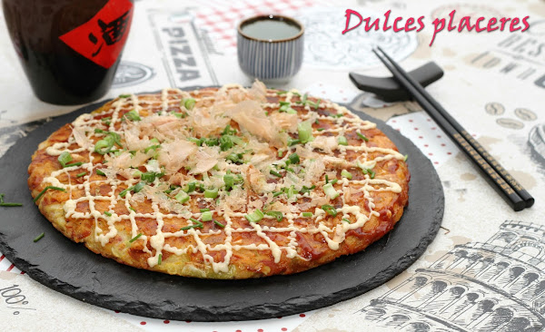- Destapamos la sartén y pintamos la pizza con salsa Okonomiyaki.