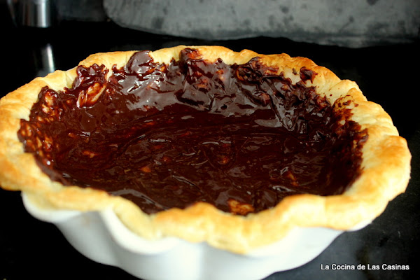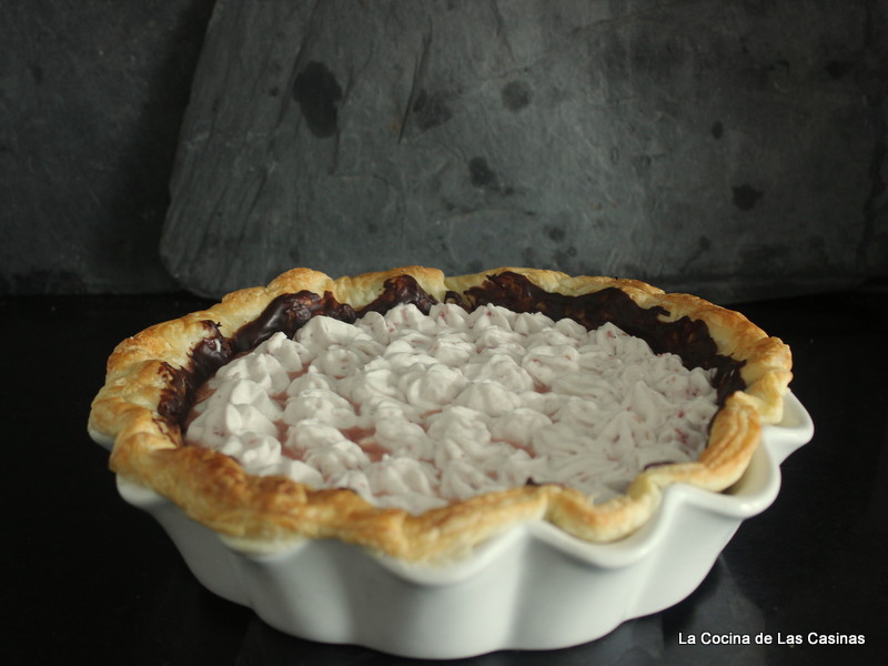 Mientras tanto deshaz el chocolate junto con la nata (crema de leche) al baño maría o en el micro en golpes de 30". Cubre el hojaldre.