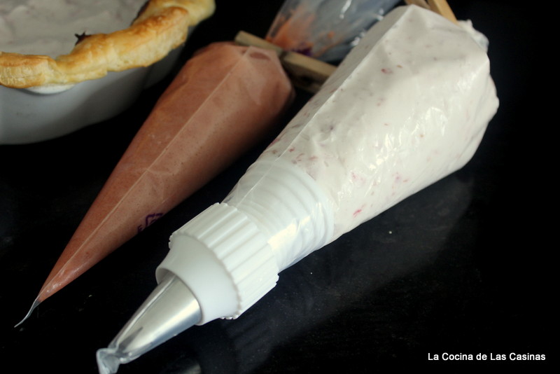 Incorpora al molde la crema y la mousse en la forma que más te guste. Como ves, empiezo a ser amiga de la manga pastelera, jajajaj.