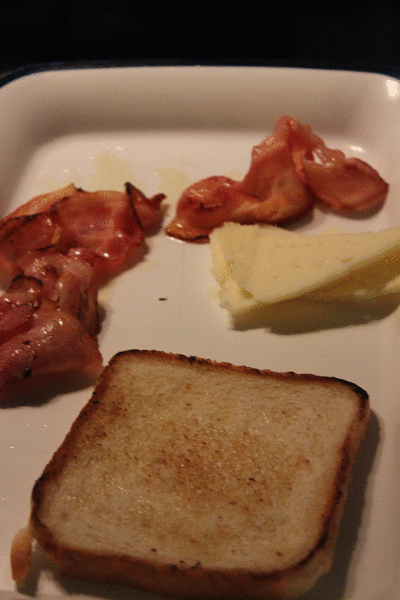 Primero hacemos un par o tres cortadas de bacon, según las que nos queramos comer (yo no pondría mas de cuatro) y tostamos el pan con el saborcillo que han dejado en la sarten. Yo utilicé pan de molde (lo que había por casa).