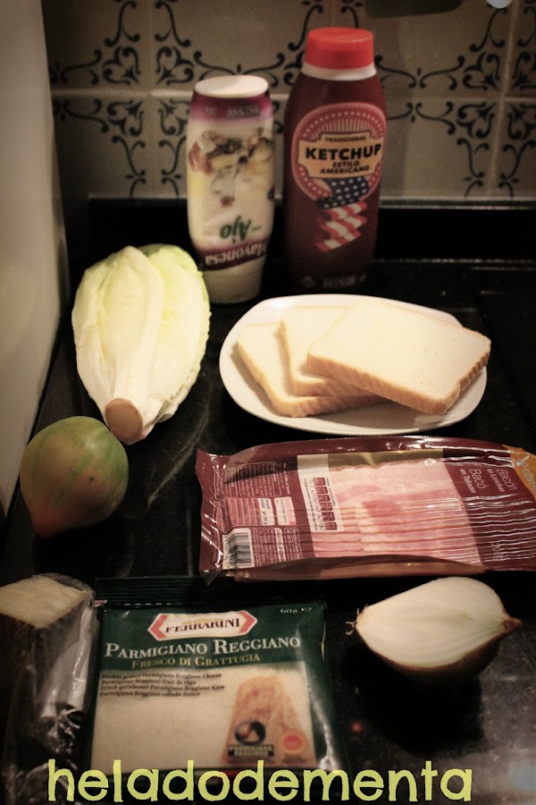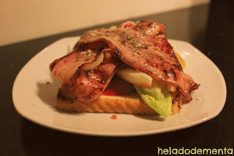 Pan > Salsas. Unas gotitas nada más. > Tomate > Cebolla > Lechuga > Bacon > Un pedacito fino de queso > Más bacon > Perejil > una pizca de queso rallado o en polvo.