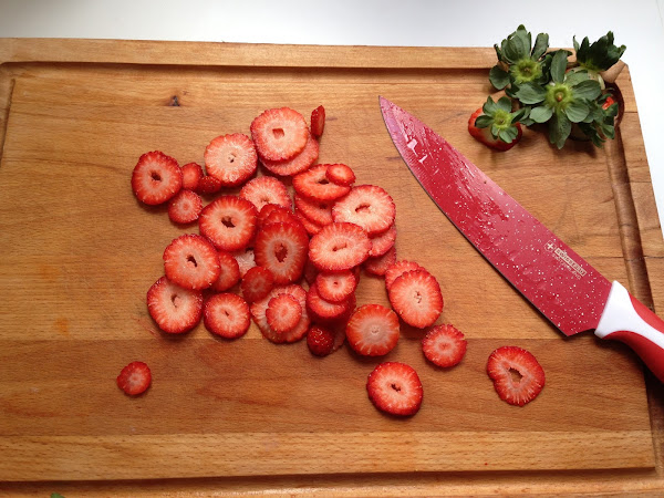 1.- Hacemos las capas de chocolate.Primer paso: cortamos la fresa en trozos no demasiados pequeños y reservamos.
