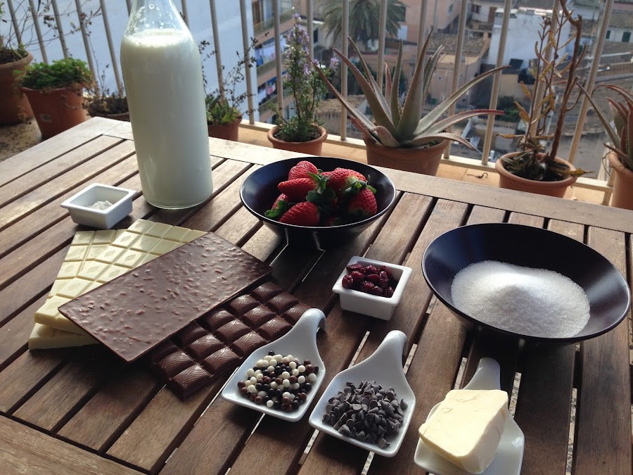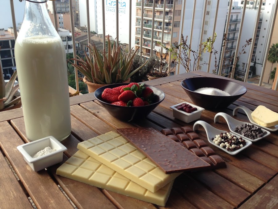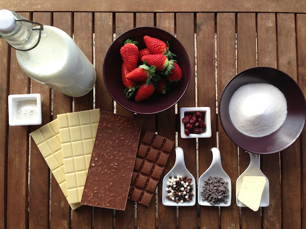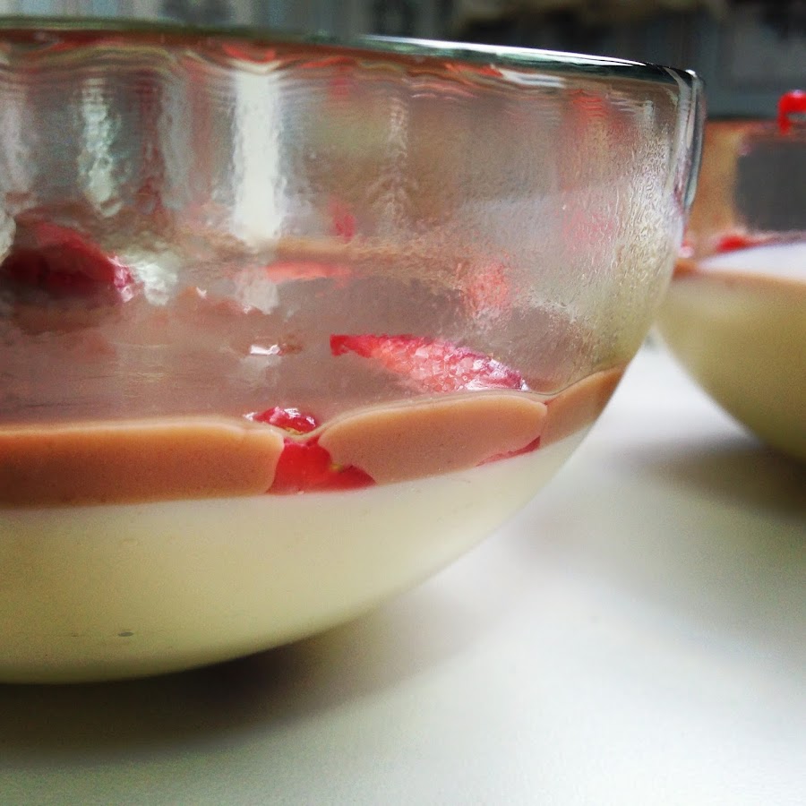 Hacemos lo mismo que para la primera capa lo único que ahora lo haremos con el chocolate con leche relleno de naranja y las siguientes cantidades: 100 gr. de chocolate, 20 gr. de azúcar, 10. gr. de quajada, 250 ml. de leche y 20 gr. de mantequilla. Una vez fundido el chocolate ponemos un poco en cada una de las copas, encima del choclate blanco que ya estará cuajando y de las fresas.