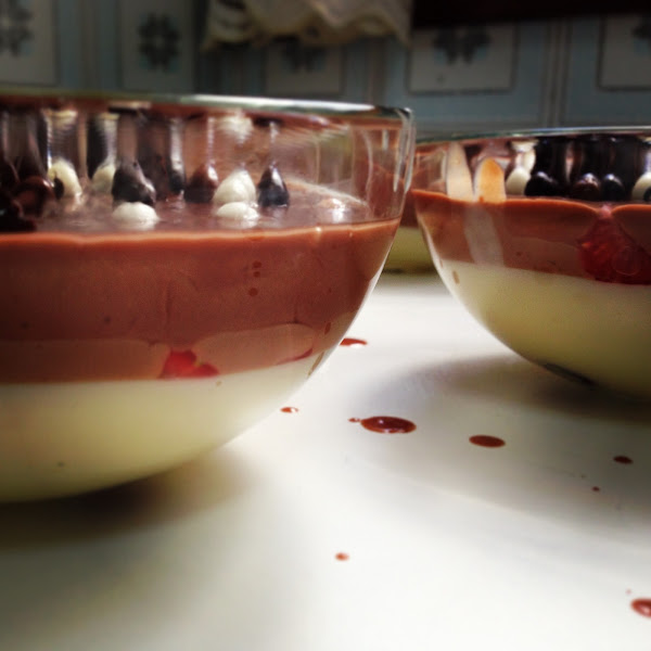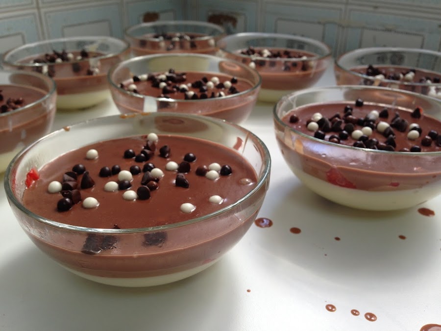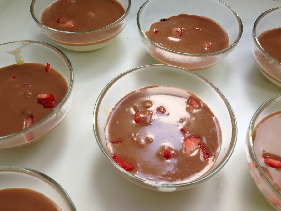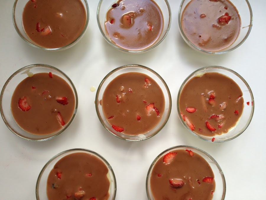 Una vez tenemos las copas finalizadas dejamos que se enfrien a temperatura ambiente. Una vez se ha enfriado el chocolate metemos en la nevera y lo tenemos mínimo unas dos horas antes de servir.