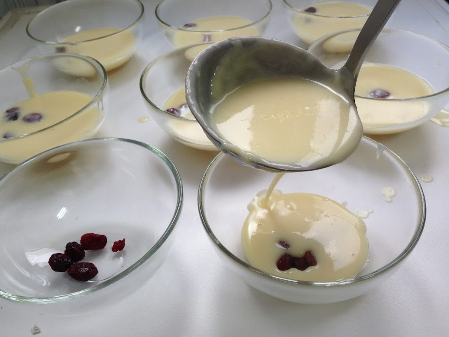 Cuando hierve paramos el fuego y vertemos un cucharón grande del chocolate fundido encima de los arándanos que tenemos en las copas.