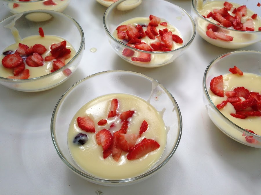 Una vez tenemos el chocolate blanco en las copas repartimos en ellas la fresa que tenemos cortada.