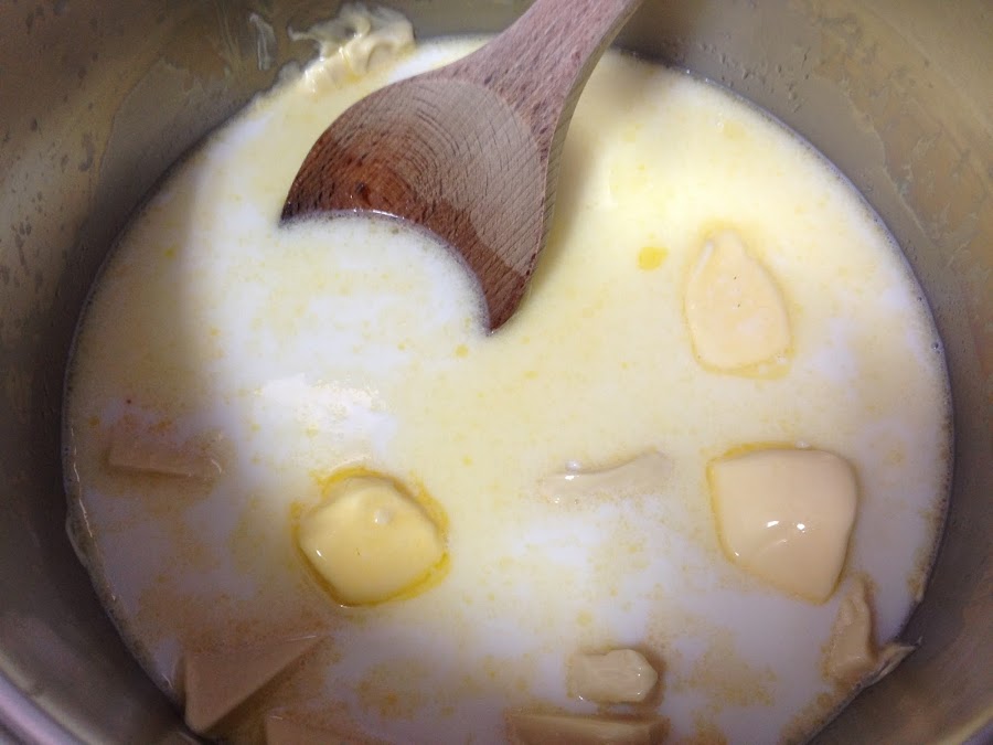 Una vez que tenemos la mezcla de azúcar y quajada reservada ponemos en una olla 750 ml. de leche semidesnatada, 50 gr. de mantequilla y 300 gr. de chocolate blanco en trozos. Lo ponemos al fuego y vamos removiendo durante todo el tiempo hasta que se funda todo el chocolate.