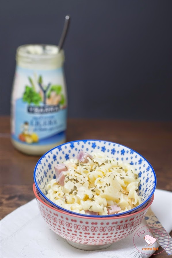 Para la salsa mezclamos la mayonesa con el liquido de la piña hasta obtener una salsa ligera. Echamos la salsa sobre la pasta,movemos y listo.Hay que dejarla reposar unas horas en frío,si es de un día para otro mucho mejor.