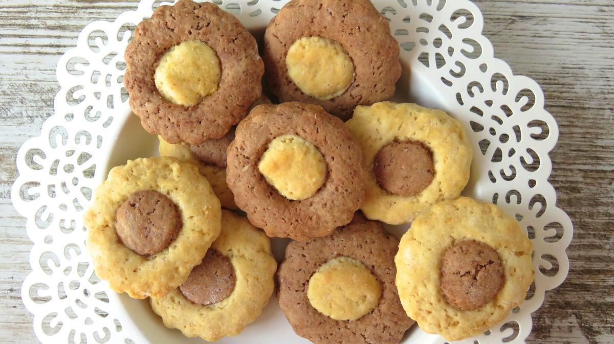 Extendemos un trozo de ambas masas con un rodillo por separado dejando un espesor de más o menos medio centímetro. Con la ayuda de un cortador redondo hacemos unos redondeles y otro más pequeño en el centro- yo utilicé un descorazonador de manzanas para hacer el agujerito central. Sacamos los agujeritos centrales de los redondeles y los intercambiamos de masas. Es decir, pasamos los agujeritos de vainilla a los redondeles de chocolate y viceversa. Quedan unas florecitas muy chulas y de dos sabores.