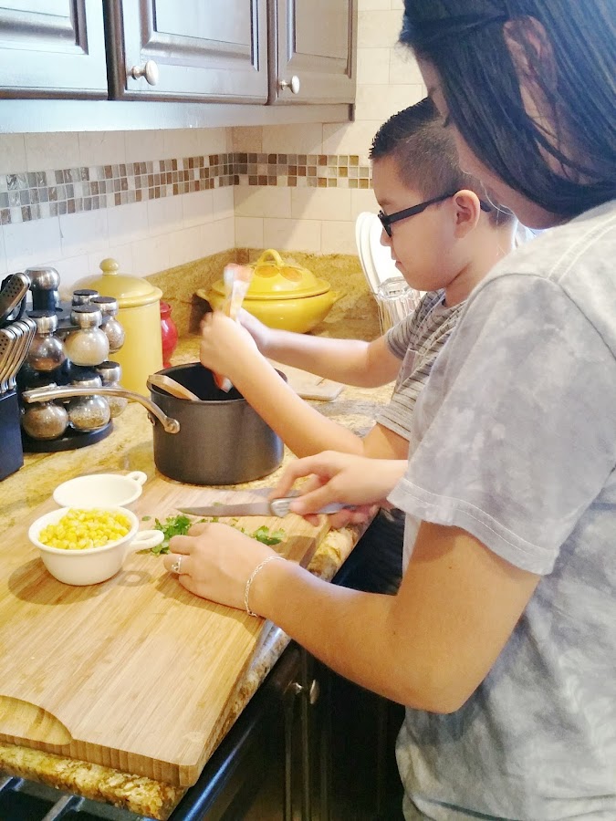 Mientras Esteban agregaba el sobre de Uncle Ben’s Ready Rice Roasted Chicken en una cacerola, mi hija picaba un poco de cilantro.