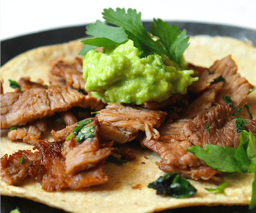 Doramos la carne de kebab en una sartén a fuego medio con un chorrito de aceite. Cortamos el tomate en dados pequeños y picamos la cebolleta en brunoise, bien pequeñita. Picamos el cilantro y pelamos el aguacate para luego machacarlo. Le añadimos el tomate, la cebolleta, la lima y el cilantro. Aliñamos al gusto con un poco de aceite, pimienta y sal. Servimos sobre una tortilla calentita un poco de salsa de guacamole. Ponemos la carne de kebab y cerramos el taco. ¡Y LISTO!