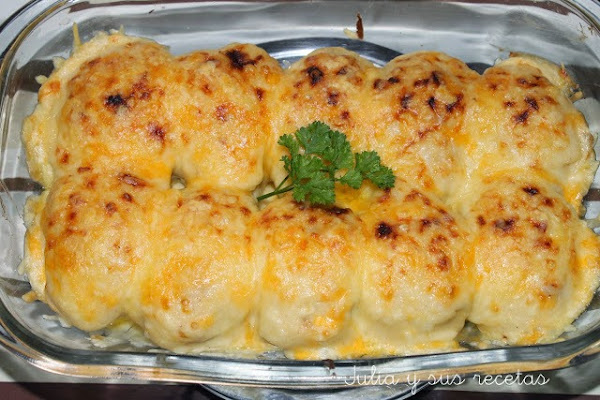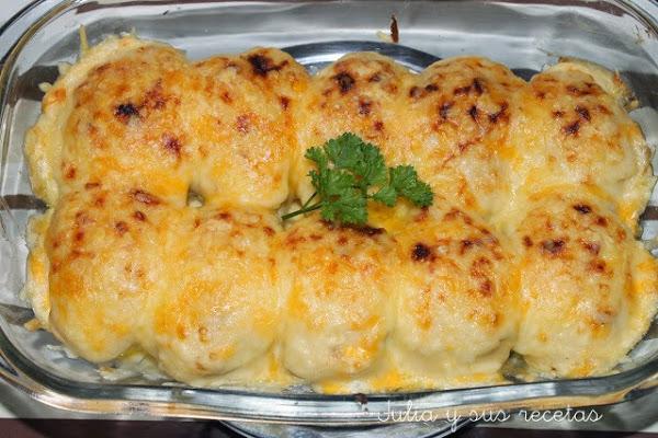 Y aquí están estos apetecibles Huevos Rellenos y Gratinados del blog de Julia y sus Recetas donde nos explica detalladamente como se hace esta rica receta. Se rellenan de carne picada, sofreímos la cebolla con aceite y luego añadimos la carne picada. Hacemos una salsa besamel y los gratinamos con un poco de queso rallado al horno unos minutos hasta que estén doraditos.