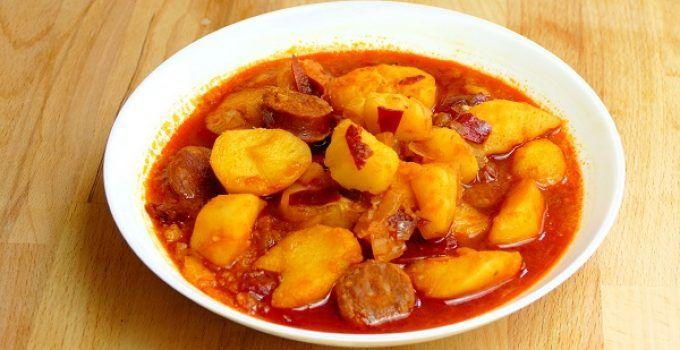 Una receta muy habitual de La Rioja, y que sirve como guiso para alimentar de forma potente a los comensales. Es especialmente solicitada en temporadas de frío porque se trata de una guarnición fuerte.Los ingredientes incluyen 6 patatas, 1 chorizo fresco, 1 puerro, 1 pimiento verde, 1/2 cebolla, 3 dientes de ajo, 1 cayena, 2 pimientos choriceros, 1/2 vaso de vino blanco, media cucharadita de pimentón dulce y picante, 1 hoja de laurel.
