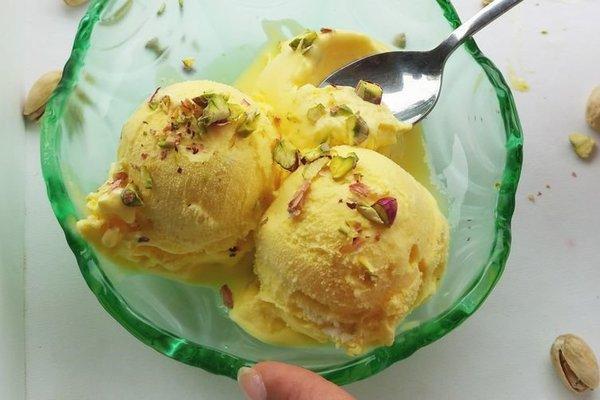 Luego, agrega el agua con azafrán sobre el el helado y mezclar hasta que todo esté perfectamente integrado