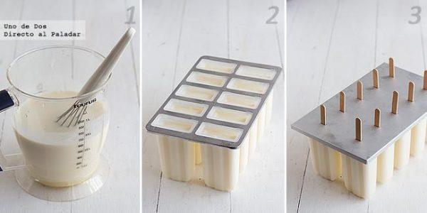 Verter la mezcla en los moldes de helados con cuidado y congelar como mínimo durante cuatro horas, o mejor toda la noche. Para desmoldar los helados podemos pasar el molde por debajo del chorro del agua de la canilla durante unos segundos.