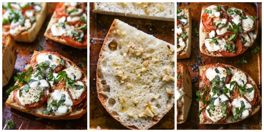 Coger el pan, untar un poco con la mezcla de mantequilla y ajo, poner rodajas de tomate, la mozzarella, espolvorear con orégano y al horno. Es una receta súper fácil y saludable y que además está riquísima.
