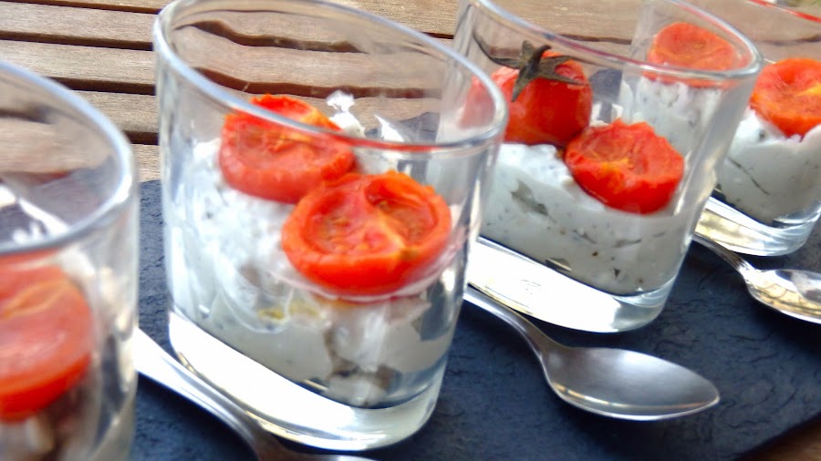 Vasitos de crema de queso de cabra y tomatitos confitados