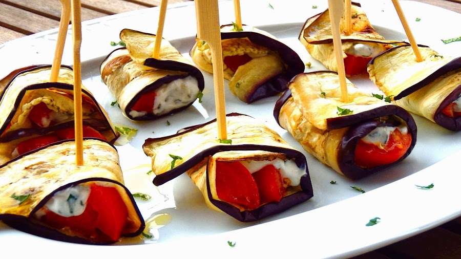 Algunos montaditos muy ligeros y sabrosos, como los rollitos de berenjena, y también dips y salsas para un aperitivo infomal pero que puedes untar en canapés o tostaditas para un acabado más elegante.
