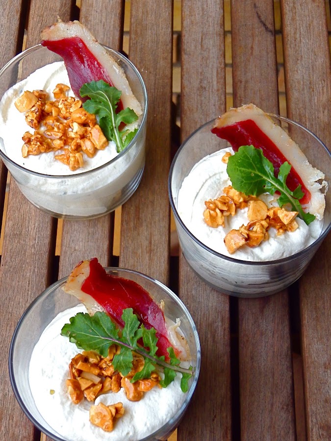 Vasitos de mousse de roquefort, praliné de avellanas y jamón de pato