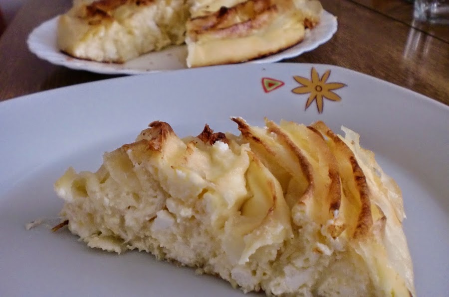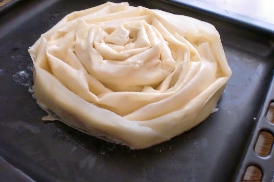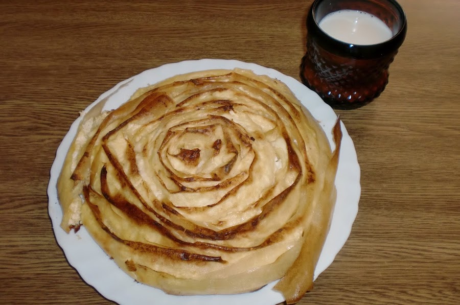 Disponemos la banitsa en una fuente de horno con cuidado. Untamos en mantequilla y huevo