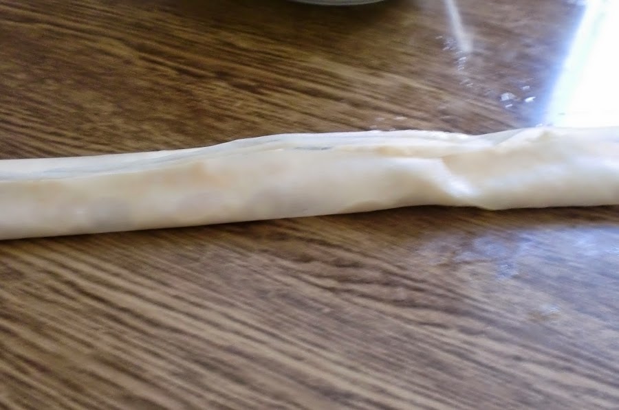 Vamos enrollando poco a poco con cuidado de no romper la masa mucho, aunque ya os digo que se os rompera algo.