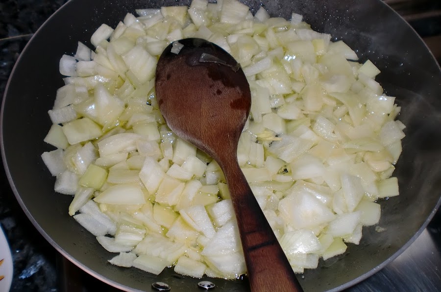 Sofreimos la cebolla cortada muy pequeña, la añadimos a los caracoles junto con las especias.