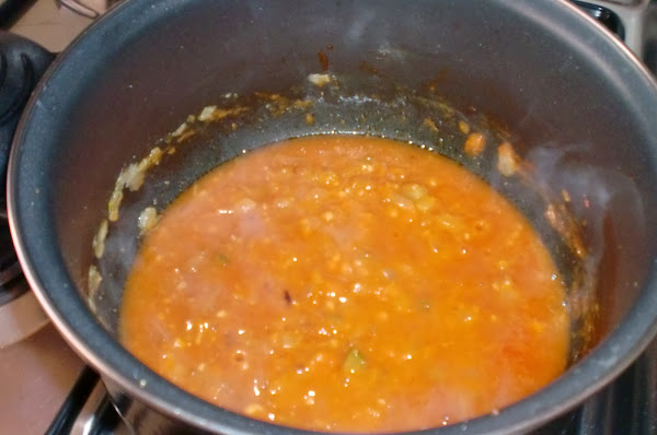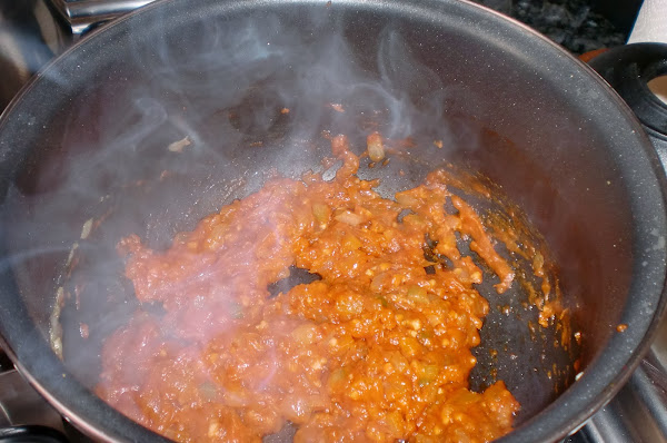 Cuando este bien sofrito todo, añadimos los tomates triturados y el azucar y, dejamos rehogar todo junto unos 8min.