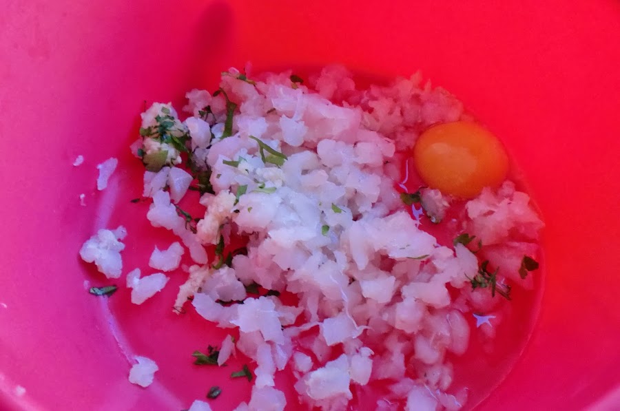 Ponemos en un cuenco todos los ingredientes de las albondigas: pescado, ajos picaditos, perejil, huevo, pan, perejil, amasamos con la ayuda de una cuchara y dejamos reposar 10 min en la nevera.