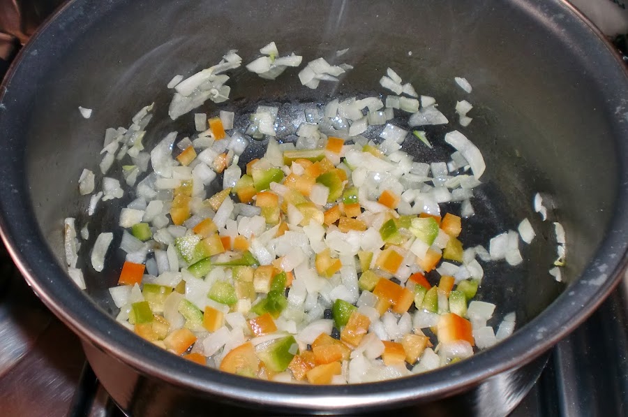 Pasamos a preparar la salsa. Ponemos en una olla un chorrito de aceite añadimos la cebolla y el pimiento troceados junto con los ajos picados y una pizca de sal.