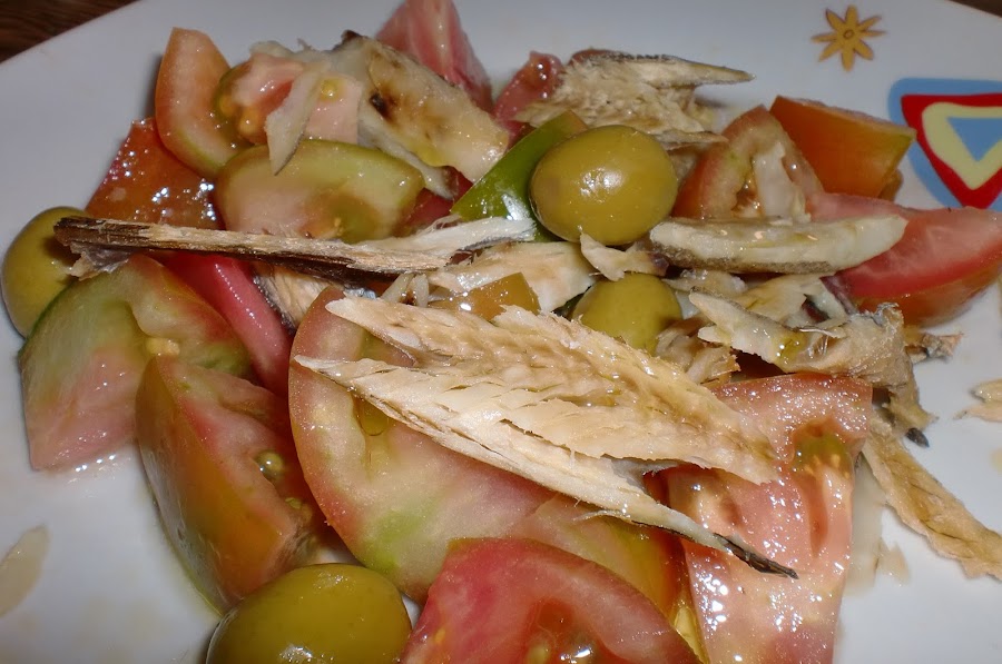 Preparamos una ensalada de tomate y olivas.