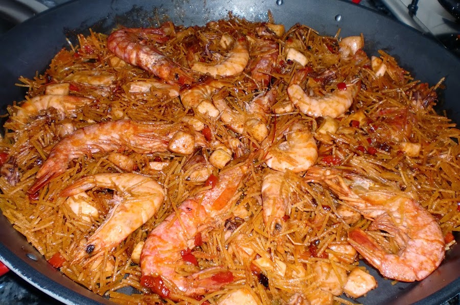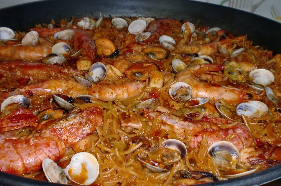 350g Fideos de fideua (aqui hay una gran variedad a mi el que me gusta usar es el que se llama "entrefino", podeis tambien usar el fideo hueco de fideua)