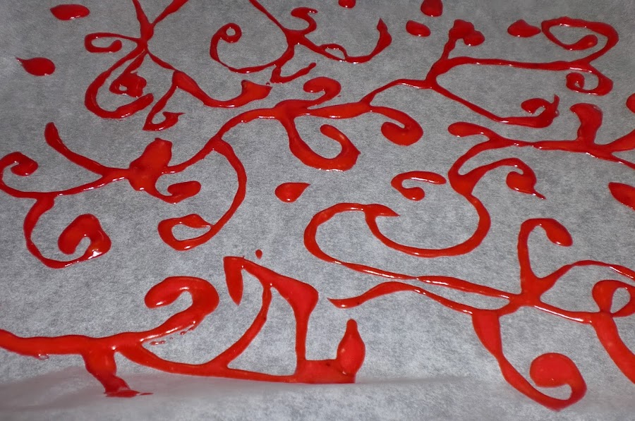Lo metemos en una manga pastelera con boquilla fina. Disponemos en una bandeja de horno papel sulfurizado y vamos dibujando sobre este nuestro diseño. Yo lo he hecho al alza pero podeis usar plantillas. Lo guardamos en el congelador.
