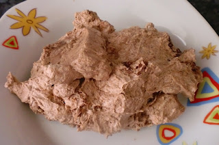 Montamos la nata (crema de leche) con la ayuda de unas varillas electricas, y cuando esta semi batida echais el azucar y el cacao (tapad con un trapo pues el polvo jejejej sale disparado.