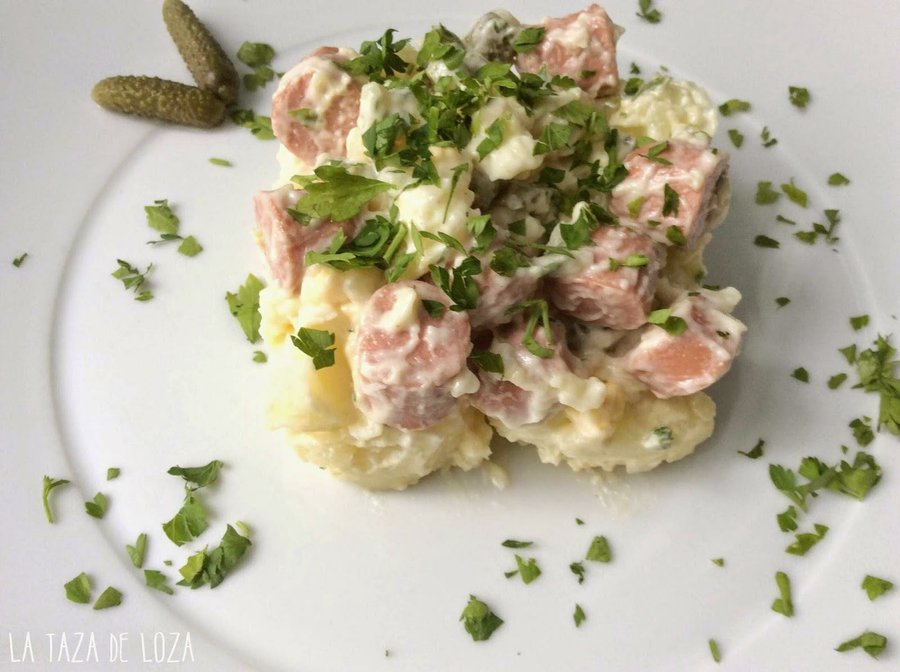 Este plato es típico en Alemania, Croacia y Austria según el blog La Taza de Loza, lo preparamos previamente cociendo las patatas cortamos y añadimos las salchichas cocidas, huevo, pepinillos y le añadimos una salsa que se prepara con mostaza, mayonesa y otros ingredientes adicionales que mezclaremos previamente. Servimos y a disfrutarla. Para ver al detalle su elaboración clic a continuación: