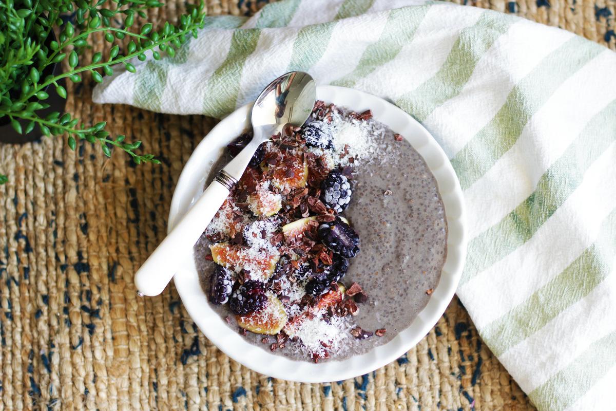 El açai es una baya muy rica en antioxidantes ideal para incorporar en nuestros desayunos. Para preparar este pudin tan solo tienes que batir medio plátano congelado con bebida vegetal de almendras (unos 150 ml.), dos cucharaditas de açai en polvo y, opcional, una cucharadita de manteca de pipas de calabaza, que nos aportan mucho zinc. Puedes servirlo con fruta a tu gusto. Yo he utilizado higos, moras, nibs de cacao y coco rallado.