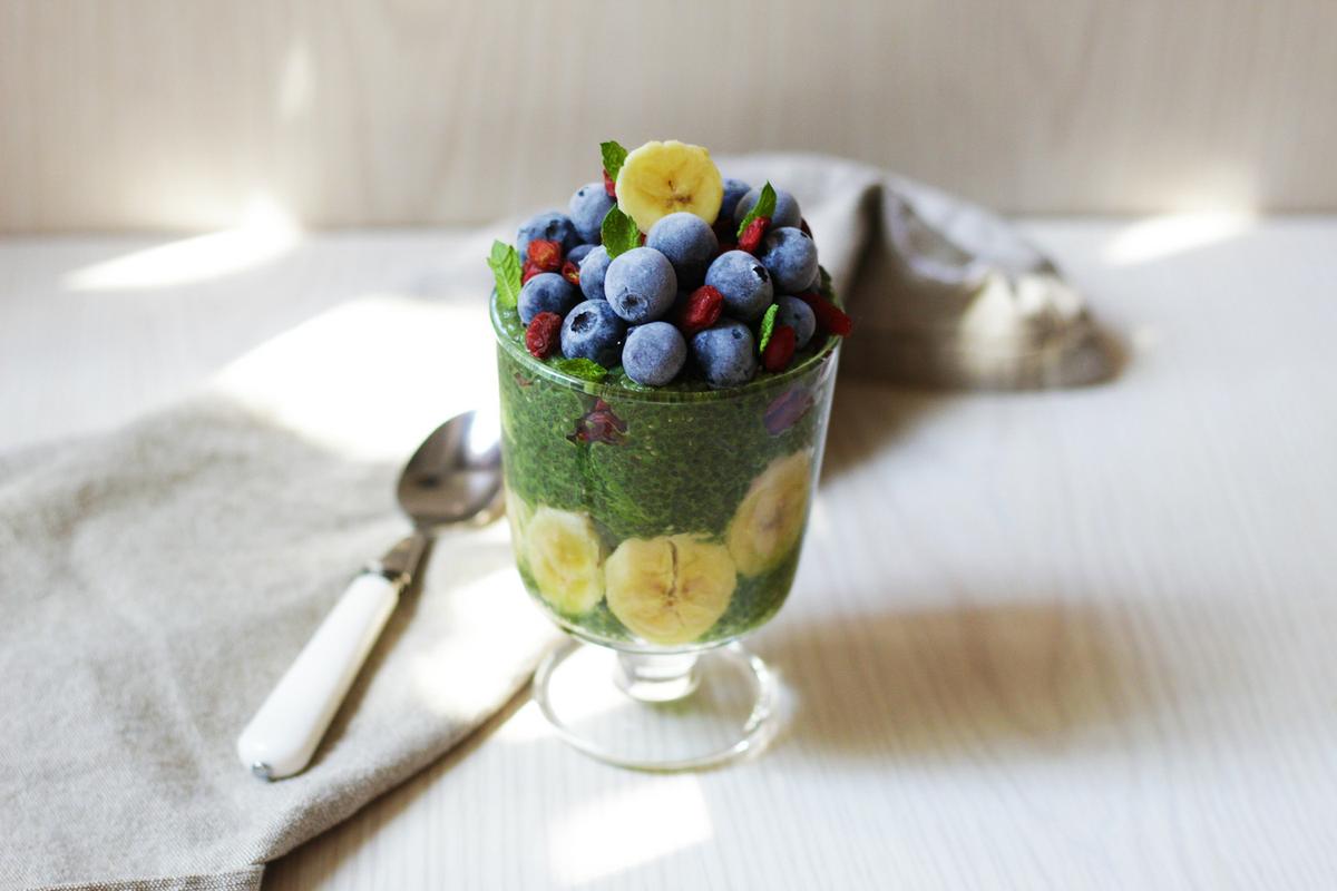 Para preparar este pudin de chia primero haremos un batido verde con 1/2 plátano congelado, un puñado de kale, un puñadito de hojas de menta y bebida vegetal o agua de coco. Ajustamos el líquido para que el batido no sea muy denso. Añadimos 1 cucharada de semillas de chía por cada 10 cucharadas de batido. Dejamos reposar 20 minutos y servimos con mucha mucha fruta.
