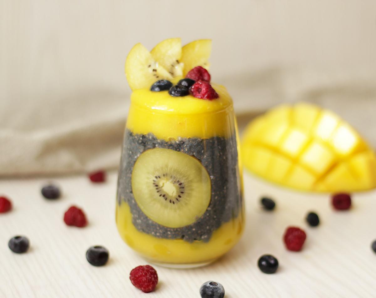 Para preparar este desayuno comenzamos mezclando un par de cucharaditas de carbón activo con un vaso de nuestra bebida vegetal favorita. Cuando esté bien mezclado añadimos las semillas de chia y dejamos reposar 15 minutos. Por otro lado pelamos el mango y lo batimos para conseguir un puré delicioso. Alternamos capas de chía y mango y ya tenemos listo el desayuno.