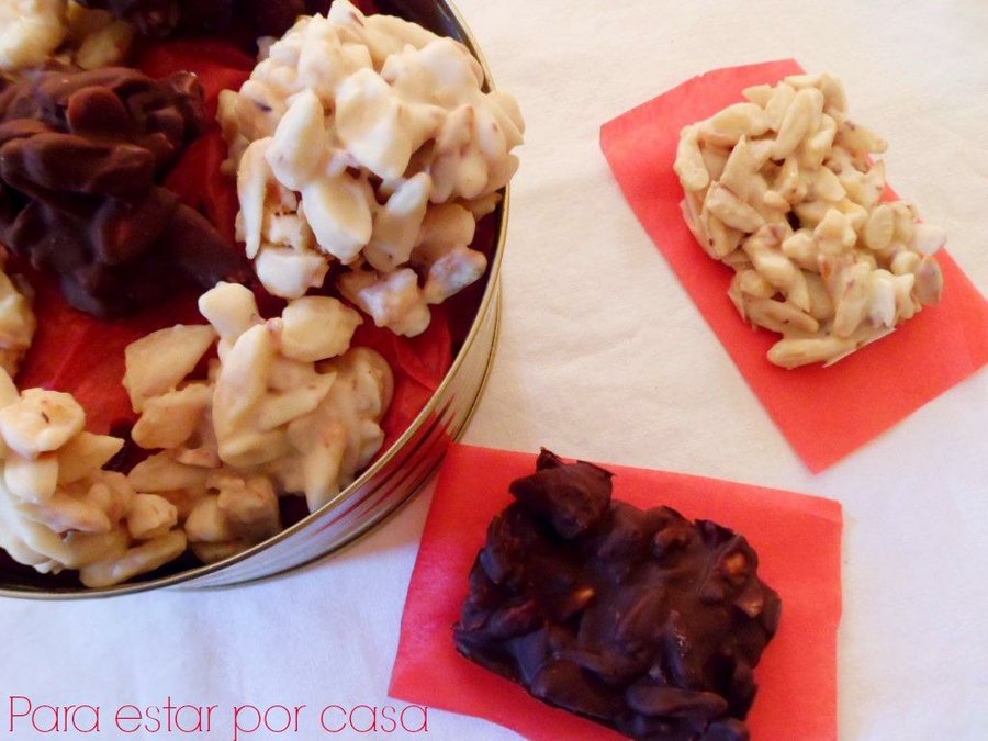 Otra receta con chocolate para tu mesa, la tienes en el blog Para estar por casa, Rocas de chocolate, necesitamos, almendras, chocolate de cobertura blanco y negro, azúcar, mantequilla y una pizca de sal. ¿y como lo hacemos? con las almendras peladas las cortaremos en bastones, y las tostamos ligeramente, haremos un caramelo con el azúcar, la mantequilla y la sal, y añadimos las almendras, y dejamos que se impregnen bien.