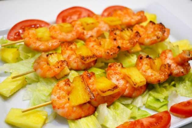Comenzamos nuestro banquete light con unas brochetas de langostinos que nos ha preparado nuestro amigo Javier de Cocina Familiar. Una delicia, rápida de hacer y más de comer. Para hacerla necesitaremos langostinos, piña, sal, aceite. No tiene ninguna complicación. Hacemos las brochetas con los langostinos y la piña y a la sartén. De todas formas, Javier nos da unos estupendos trucos para que queden perfectas, no se nos peguen y estén en su punto. En su vídeo lo verás todo. ¡Corre, que se acaban!
