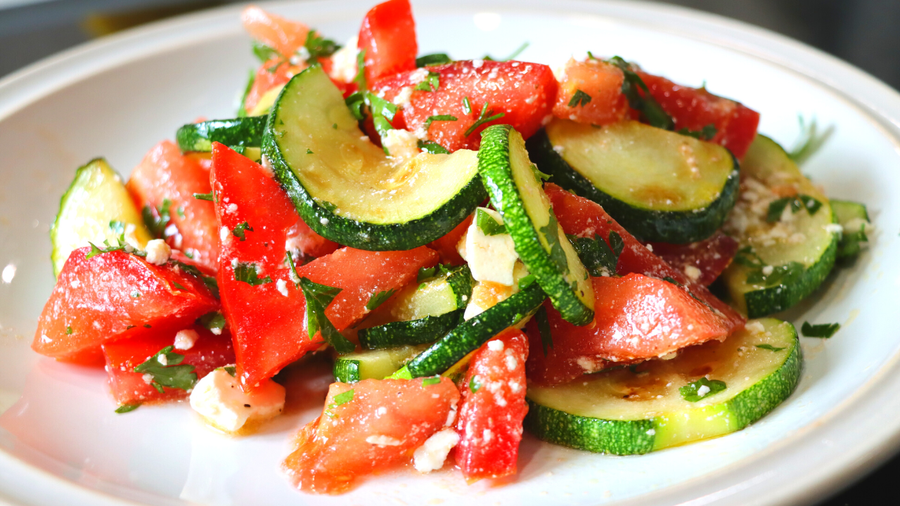 2. Cortar tomate y perejil. Mezclar tomate, calabacín y perejil.