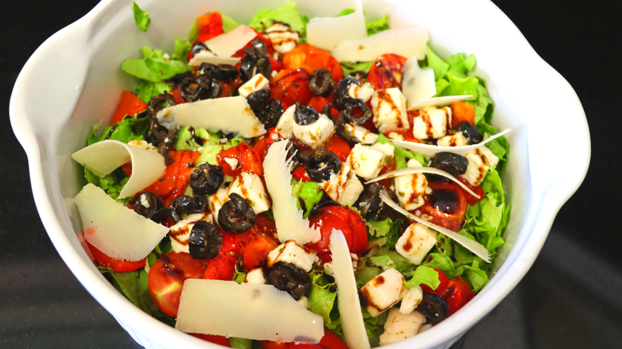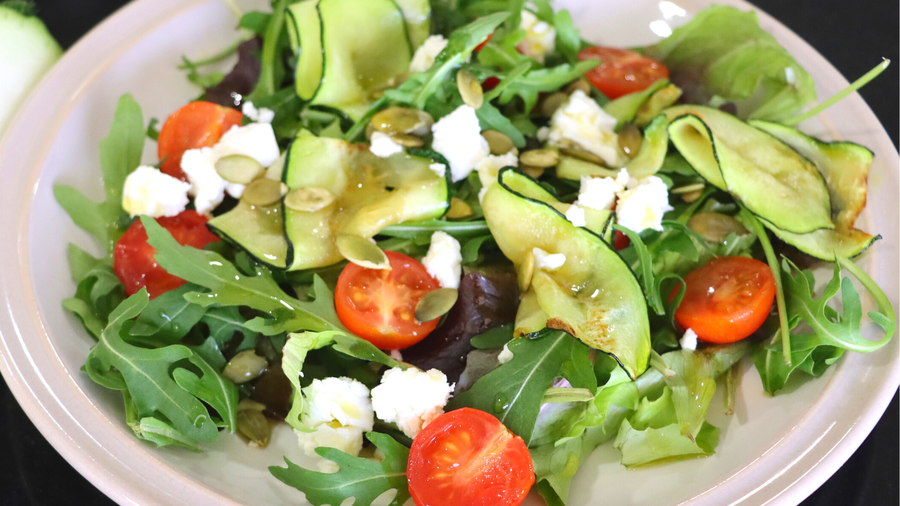 2. Colocar en un plato los ingredientes: hojas de ensalada, tomates, queso feta y calabacín.