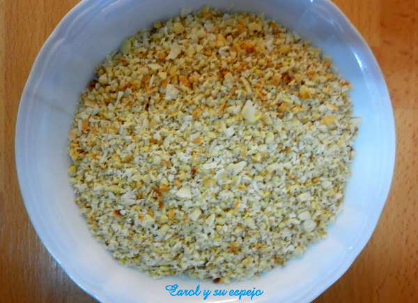 4. Tostamos las almendras y los piñones, picamos muy finos y reservamos.