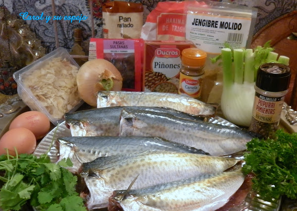 Lavar y poner a remojo las pasas. Cortar muy finas las cebollas. Limpiar las caballas sin abrirlas, lavar y limpiar con cuidado. Extraemos la carne de 2 de las caballas más pequeñas que tengamos, hacemos puré la carne de caballa extraída. Tostamos las almendras y los piñones, picamos muy finos y se aparta. Se fríen las cebollas durante 3 minutos, agregar la carne triturada, las almendras y piñones, las pasas, el perejil y el hinojo, condimentamos con sal, pimienta, cilantro, canela y jengibre. Cocinar durante 5 minutos sin parar de remover.