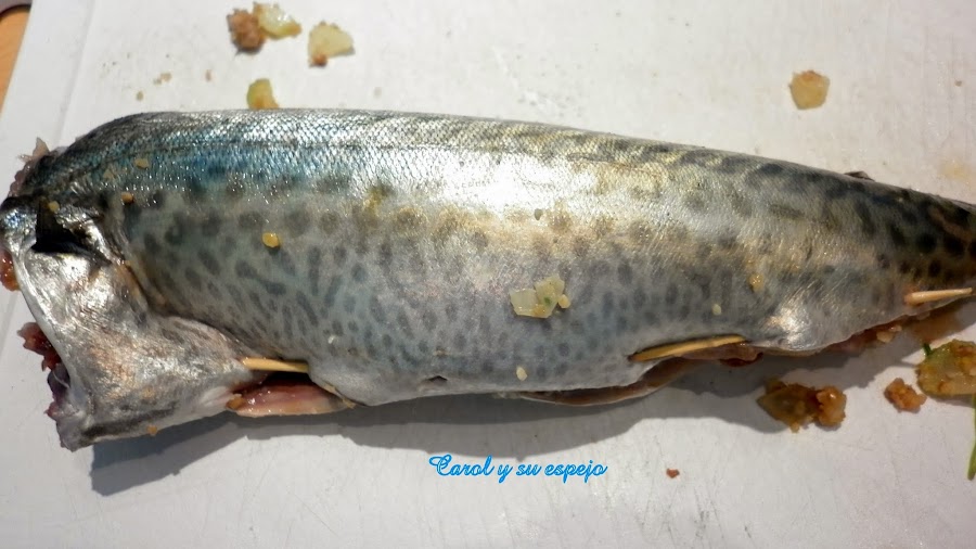 7. Rellenamos las caballas, limpias de espinas y le ponemos unos palillos para que no se abran