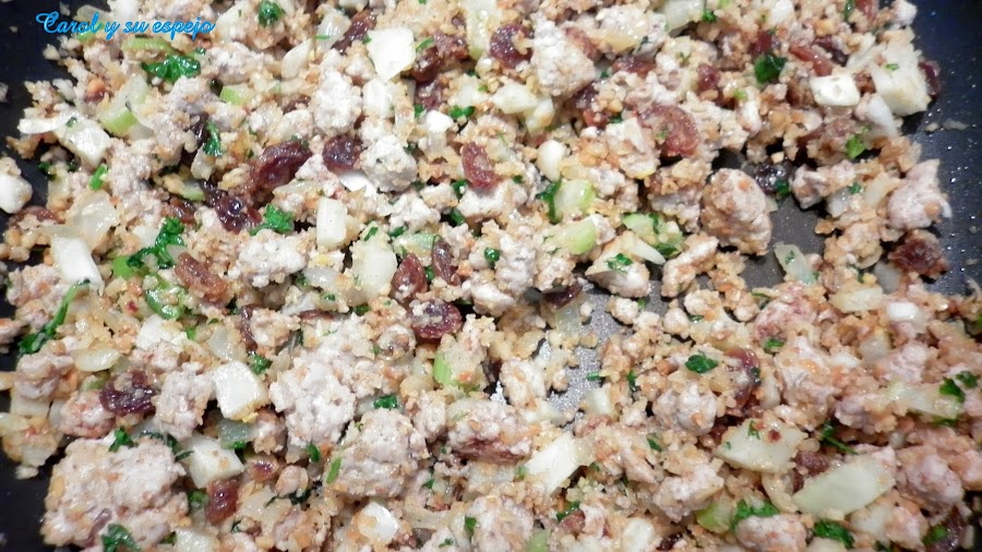 5. Cortamos la cebolla muy finamente y se fríen hasta que estén doraditas, agregamos la carne de caballa triturada, las almendras y piñones triturados, las pasas que teníamos en remojo que habremos escurrido, las dos cucharadas de perejil picado y el hinojo cortado a trocitos pequeños, condimentamos con sal, pimienta, cilantro, canela y jengibre.