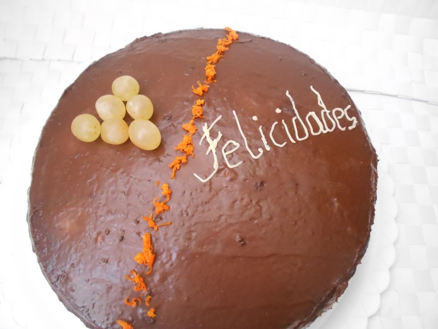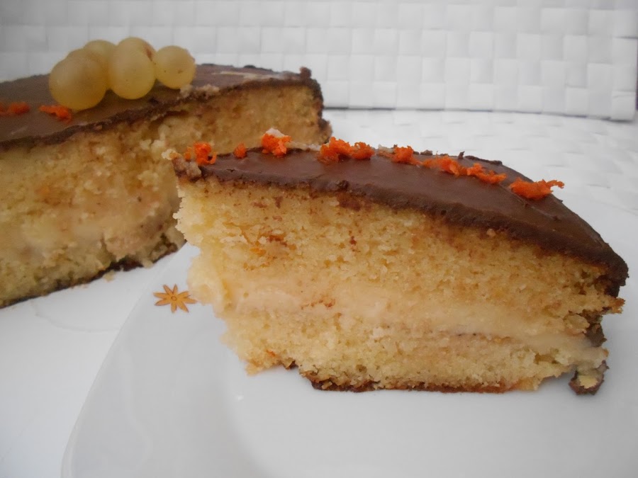 Una tarta con un bizcocho de almendras y uva, rellena de crema pastelera y cubierta de chocolate