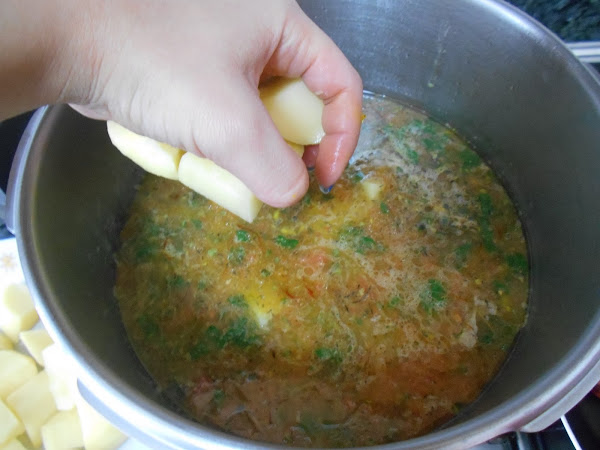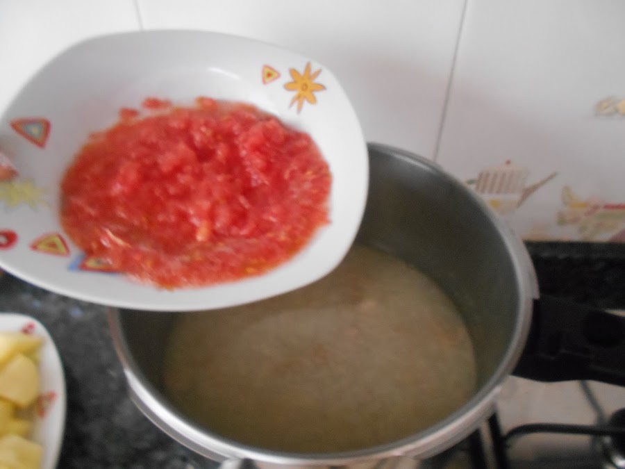Cuando el cordero esté abrimos la olla y echamos el tomate rallado, la picada y las patatas.