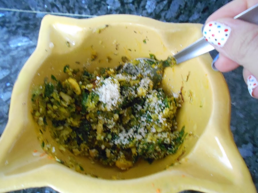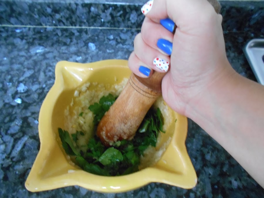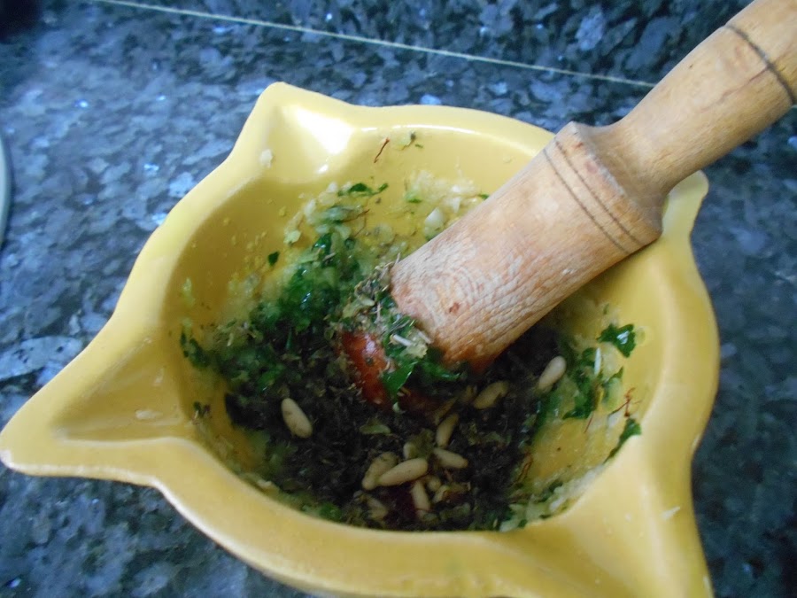 Añadimos el perejil y lo picamos también en el mortero.