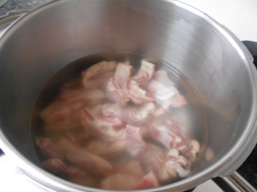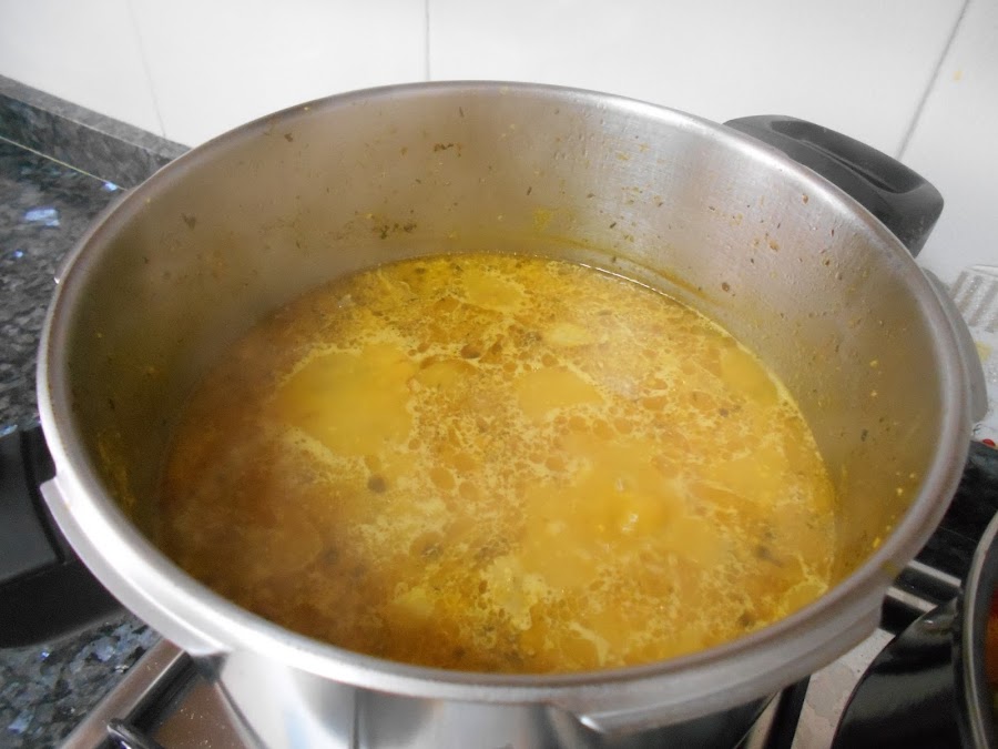 Empezamos lavando y poniendo a cocer el cordero en una olla. Yo en esta ocasión lo he puesto en la olla express 10min.