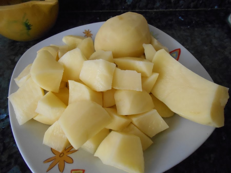 Pelamos las patatas y las cortamos en trozos no muy pequeños chascandolas.